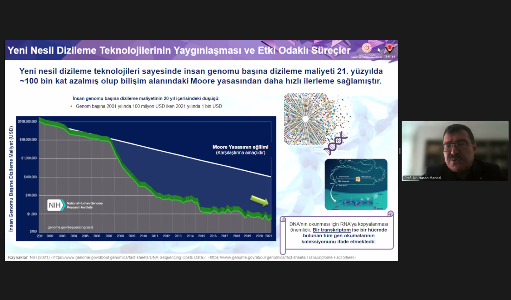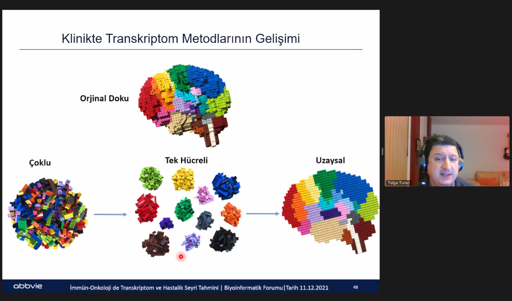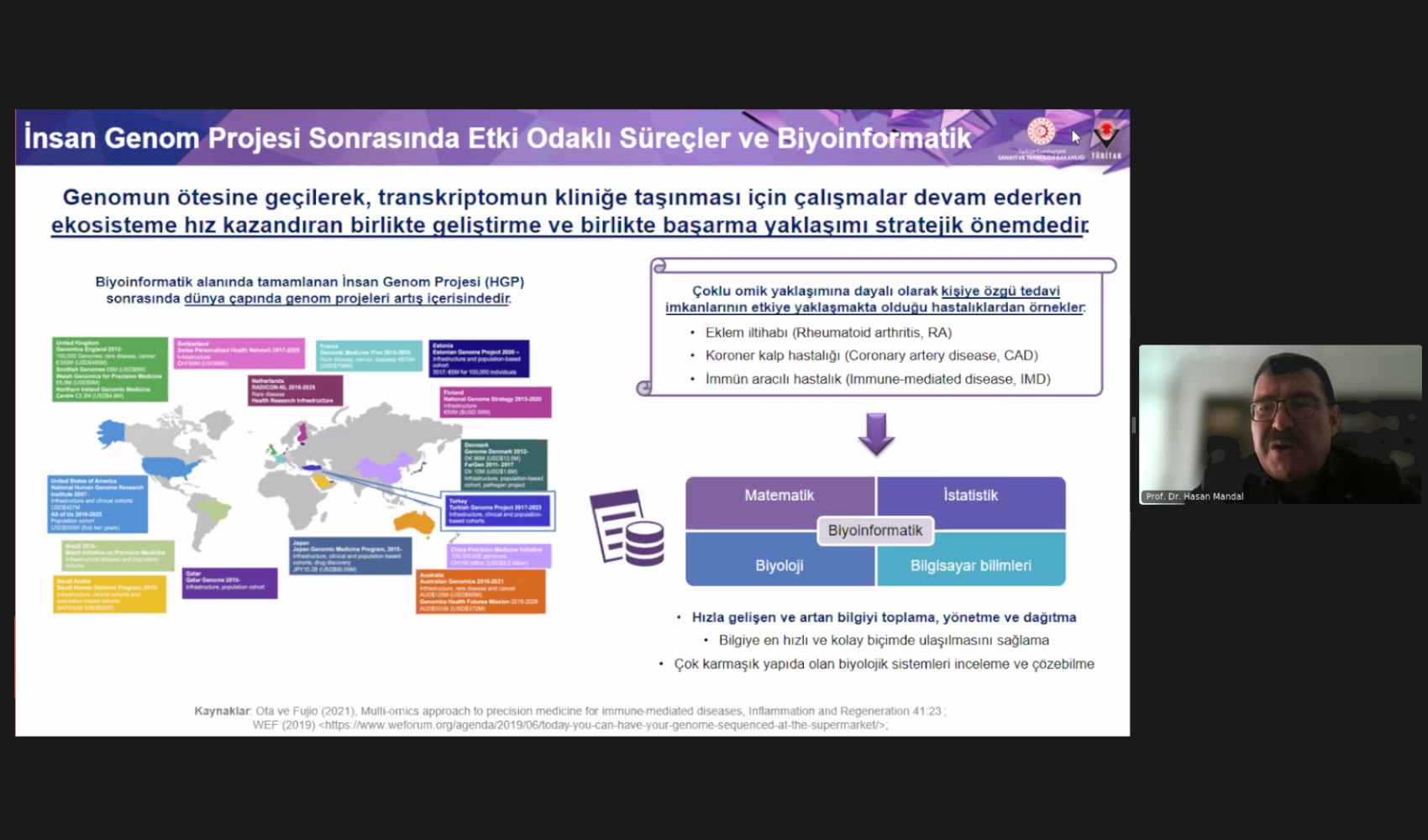 6. Biyoinformatik Forumu’nu 11 Aralık 2021’de, “Klinikte Transkriptom” başlığıyla dijital ortamda gerçekleştirdik. Yeni nesil dizileme teknolojisi ile, özellikle son on yılda, büyük ölçekli moleküler veri (genomik, transkriptomik, epigenomik vb.) üretiminin hızı artarak maliyeti düşmüştür. Bu doğrultuda, daha etkin ve kişiye özel tanı ve tedavi imkanlarıyla hassas tıp (precision medicine) uygulamaları klinikte daha ulaşılabilir hale gelmiştir. Hastaların DNA dizileme verisinden elde edilen bilgilerle moleküler tanıda çok ilerleme kaydedilmiş, klinikte genom uygulamaları artık tüm dünyada önemli bir yer edinmiştir. Bunun ötesinde, hastalıkları moleküler düzeyde çok daha iyi anlamamıza imkân veren, farklı omik verileri bir arada kullanan multi-omik yöntemleri klinikte rutin uygulamaya geçirmek için çalışmalar son yıllarda hassas tıp gündemine girmiştir.